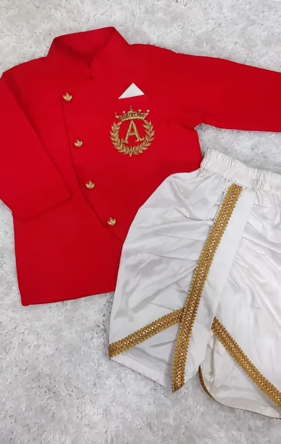 ✨ Dress your little one in timeless elegance with our Premium Boys Raw Silk Kurta & Chanderi Dhoti Set.