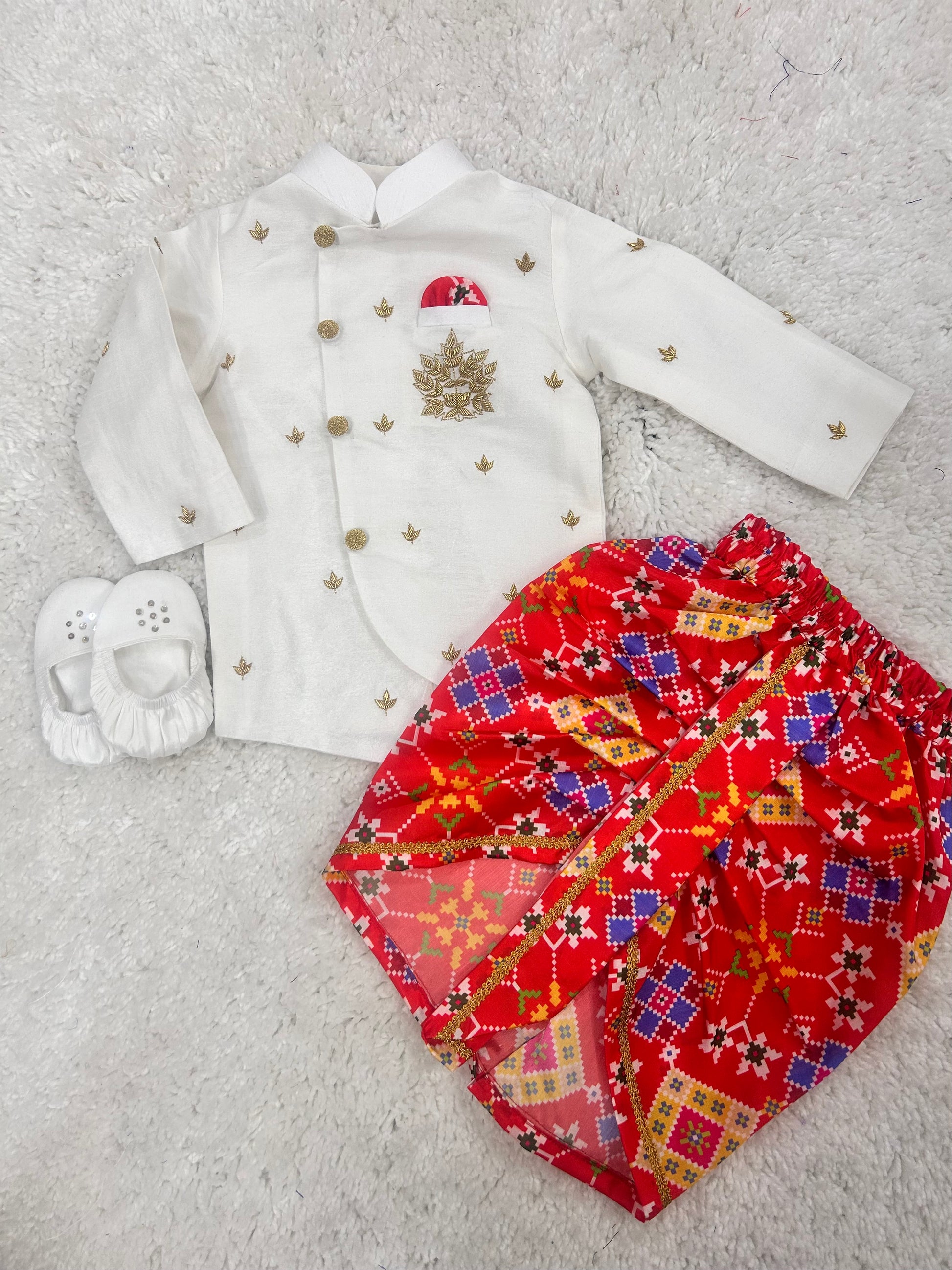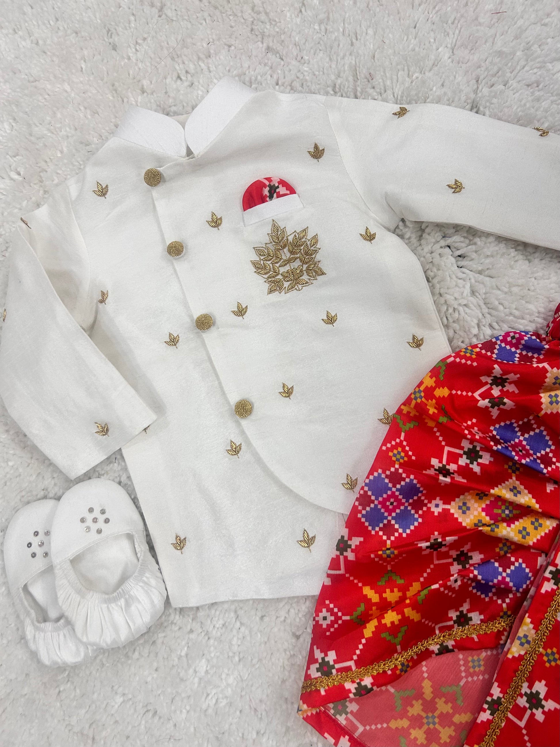 Timeless and refined, this White Kurtha and Patola Dhothi Set is a celebration of heritage and artistry. The kurtha features intricate hand embroidery detailing all over, offering a subtle yet sophisticated texture that speaks to traditional craftsmanship. Paired with a vibrant Patola-style dhothi, this ensemble beautifully blends minimalism with cultural richness.