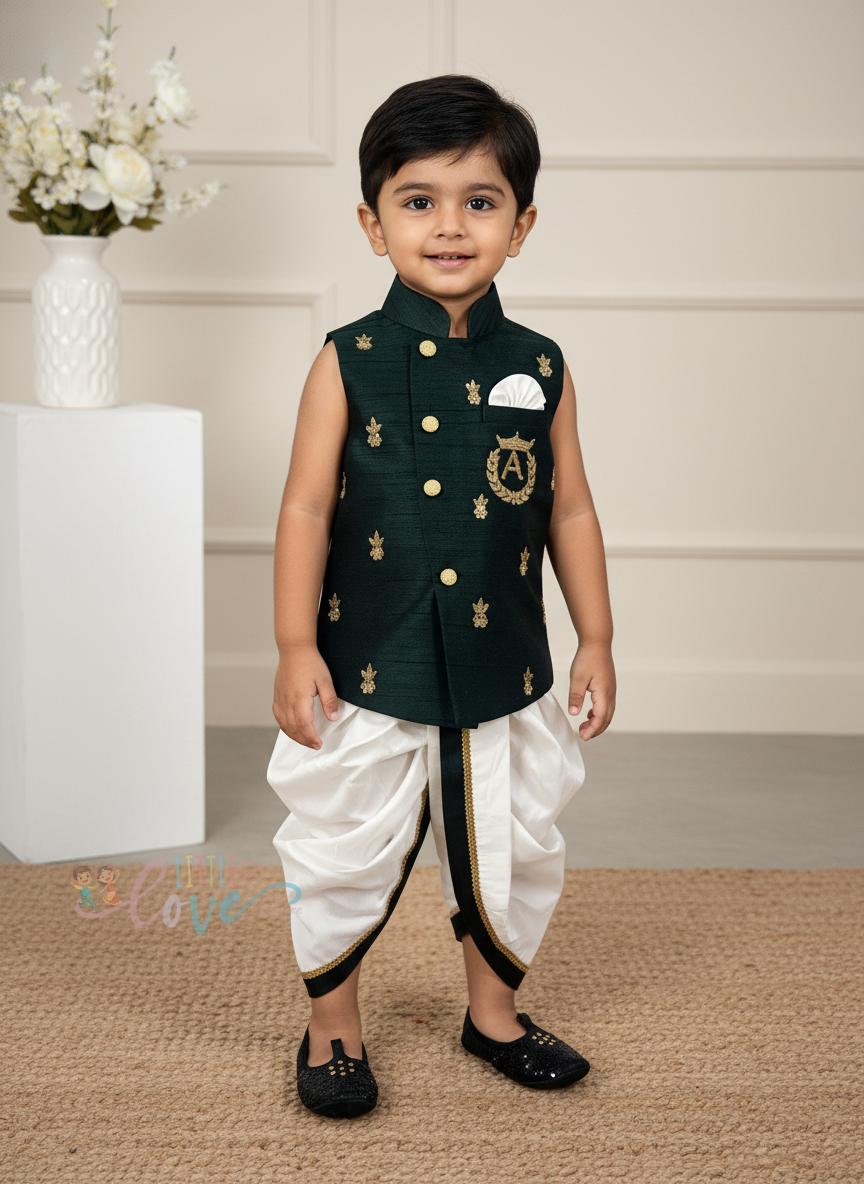 Chic and rooted in tradition, this Sleeveless Bottle Green Kurtha Set is a standout piece for effortless festive style. The rich bottle green hue exudes depth and elegance, while the all-over butties add a delicate touch of traditional artistry across the fabric.