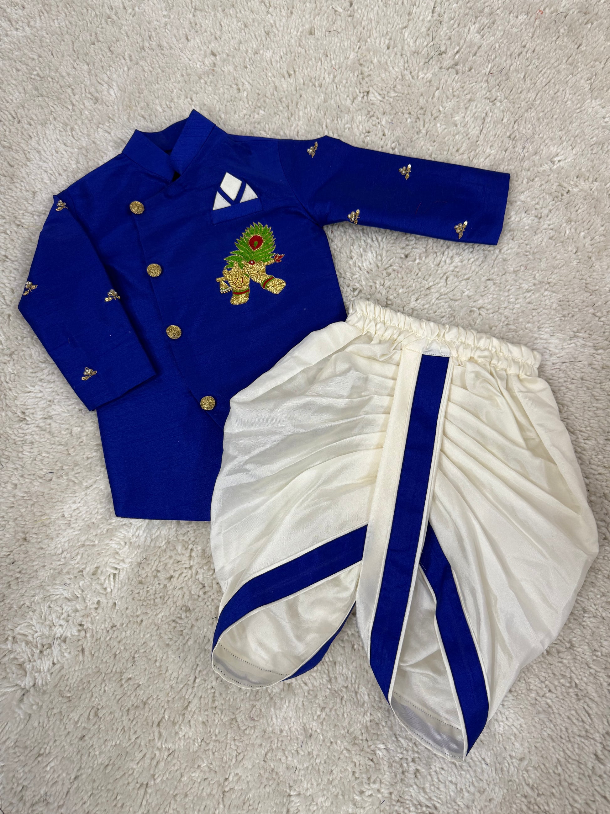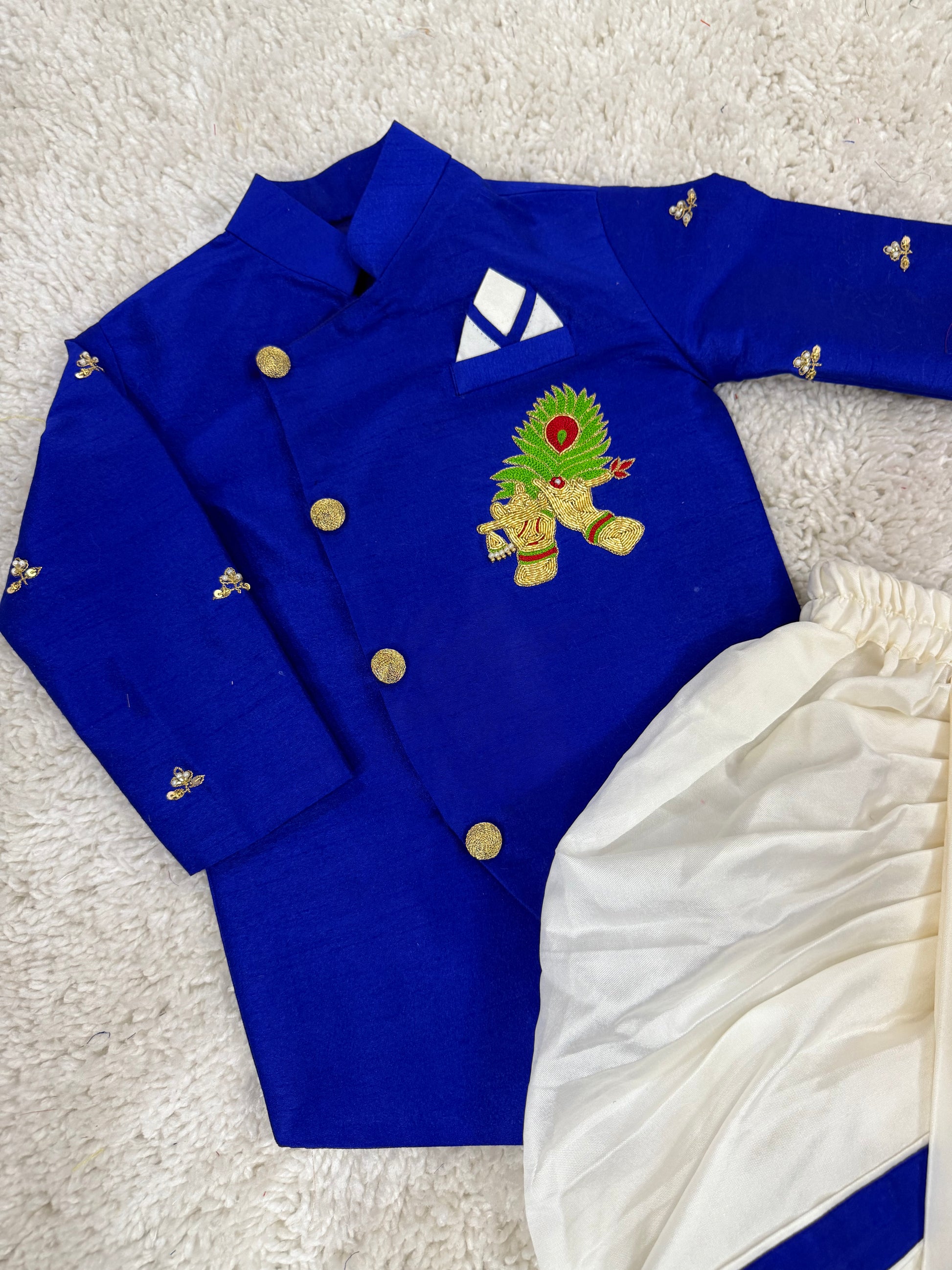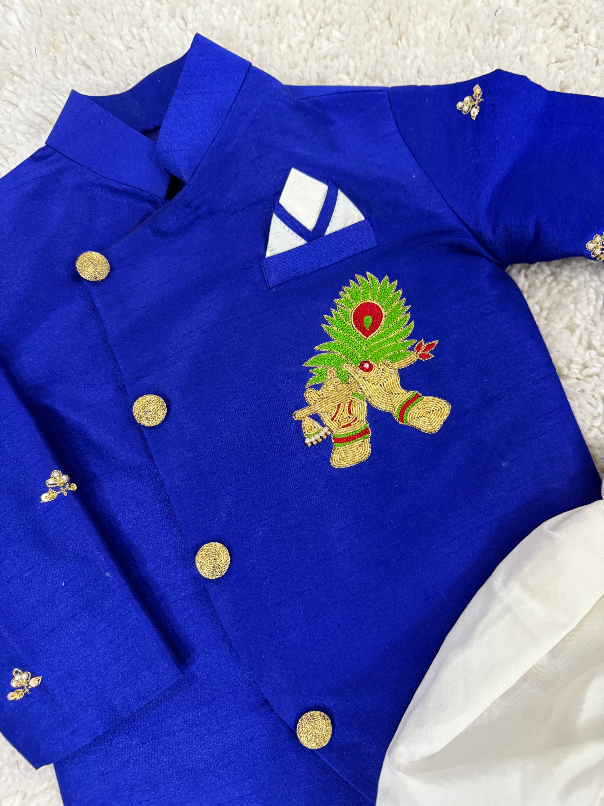 Rich royal blue kurtha with delicate Krishna feather detailing on pockets