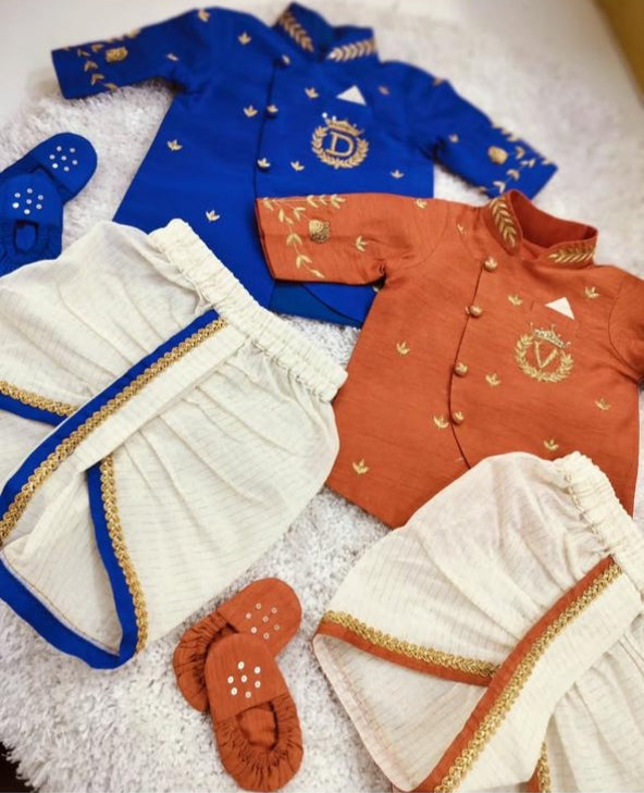 โจ Dress your little one in timeless elegance with our Premium Boys Raw Silk Kurta & Chanderi Dhoti Set.