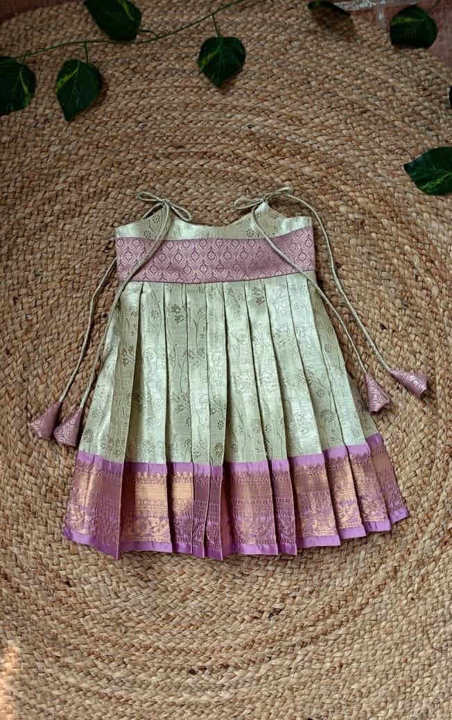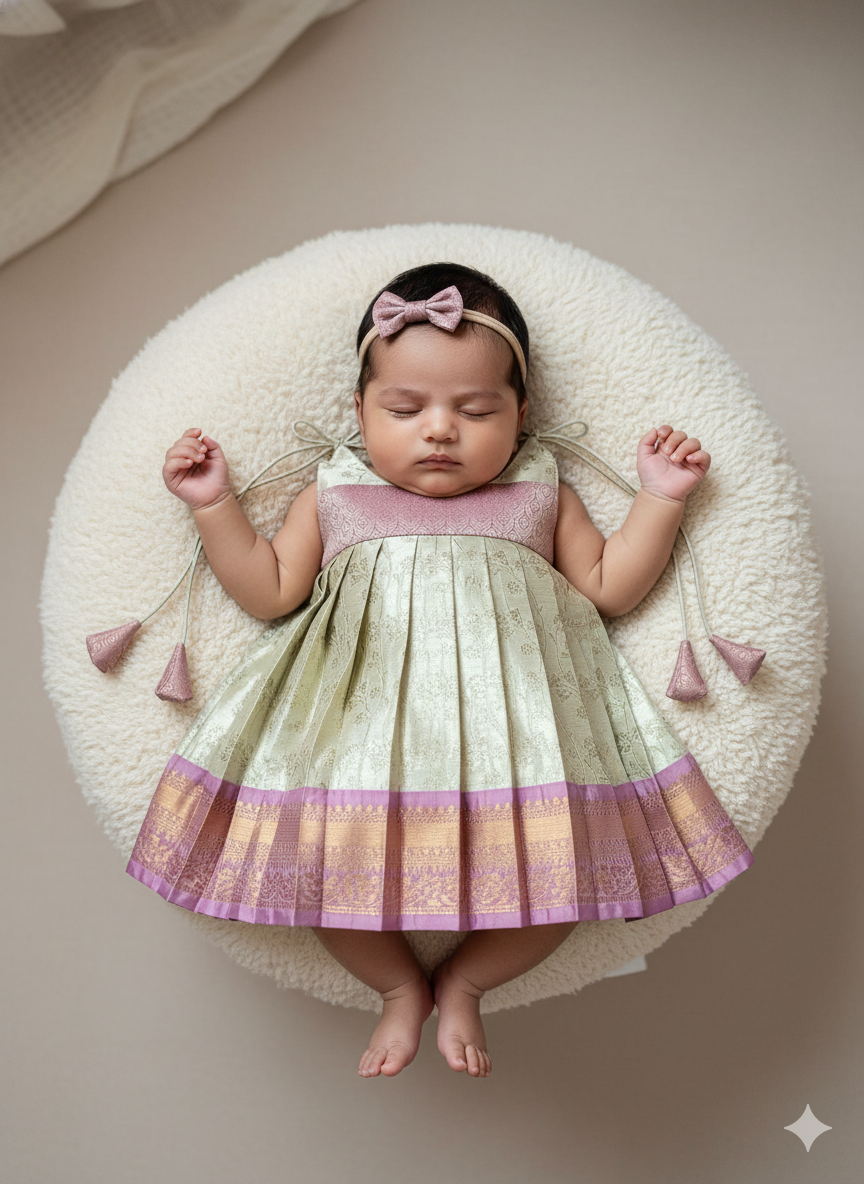 Made from premium soft silk fabric, this elegant frock is designed to give a rich traditional look while keeping your little one comfortable. The sleeveless tie-up style gives a soft and airy fit, perfect for newborns and babies.