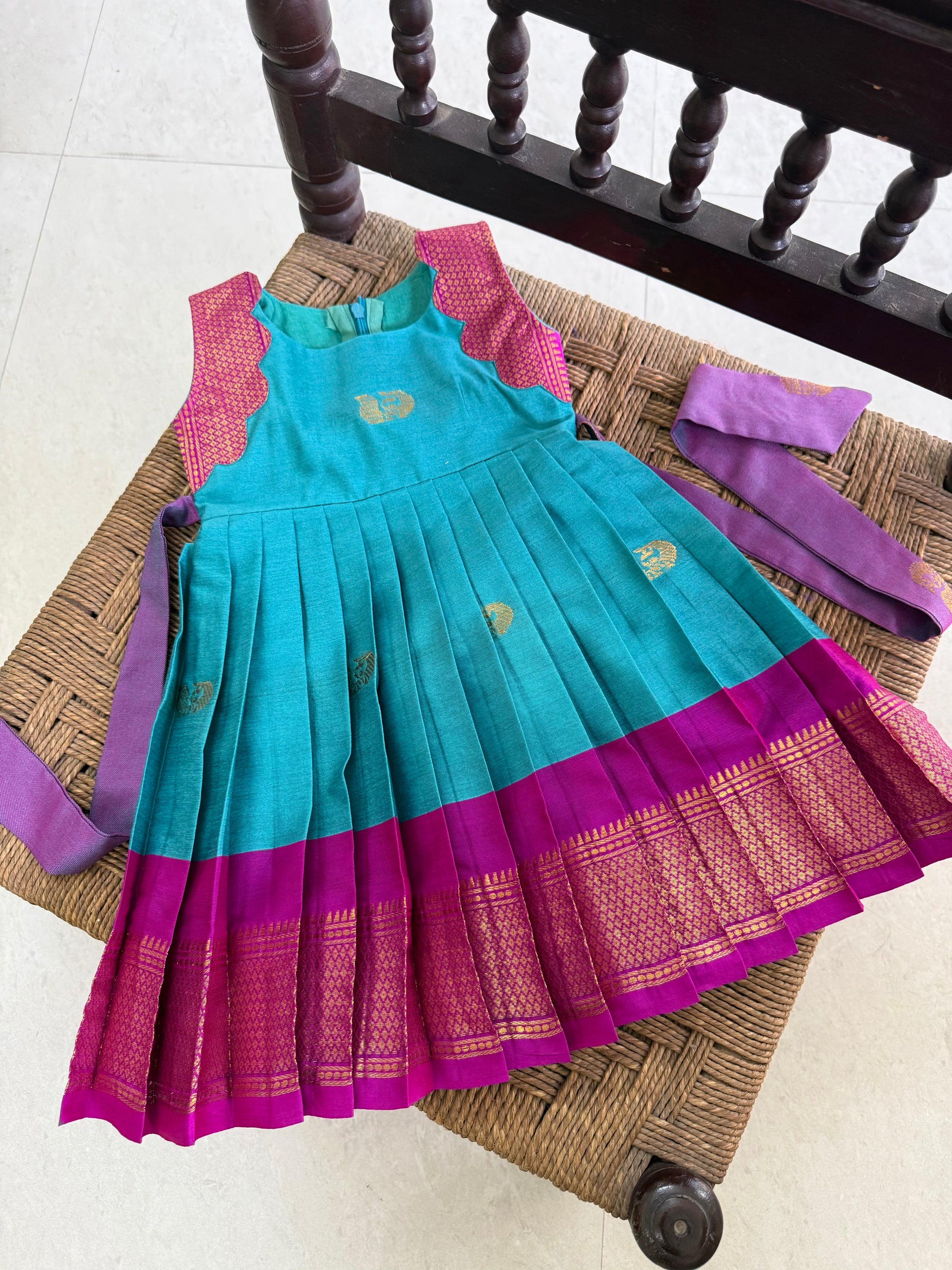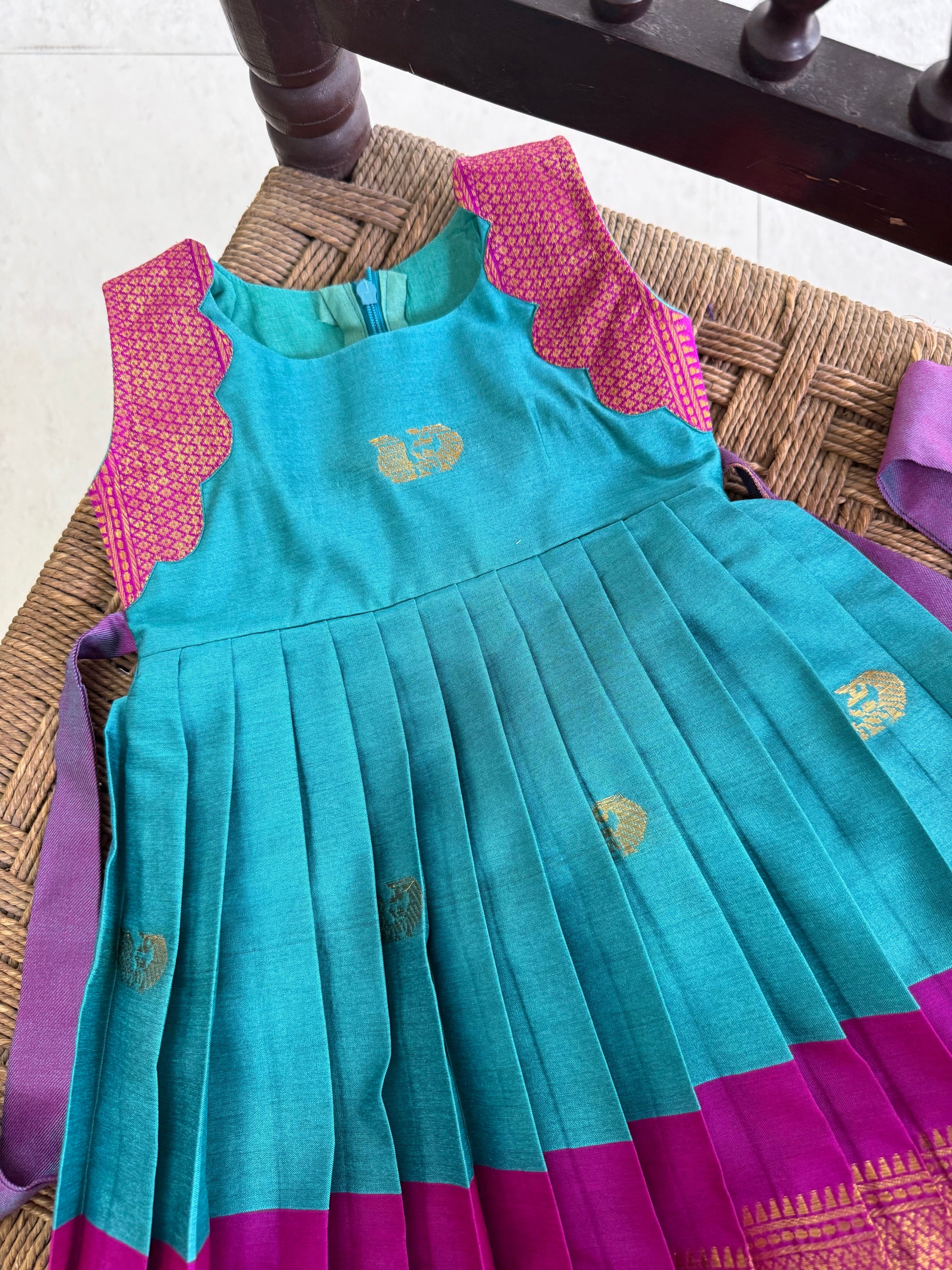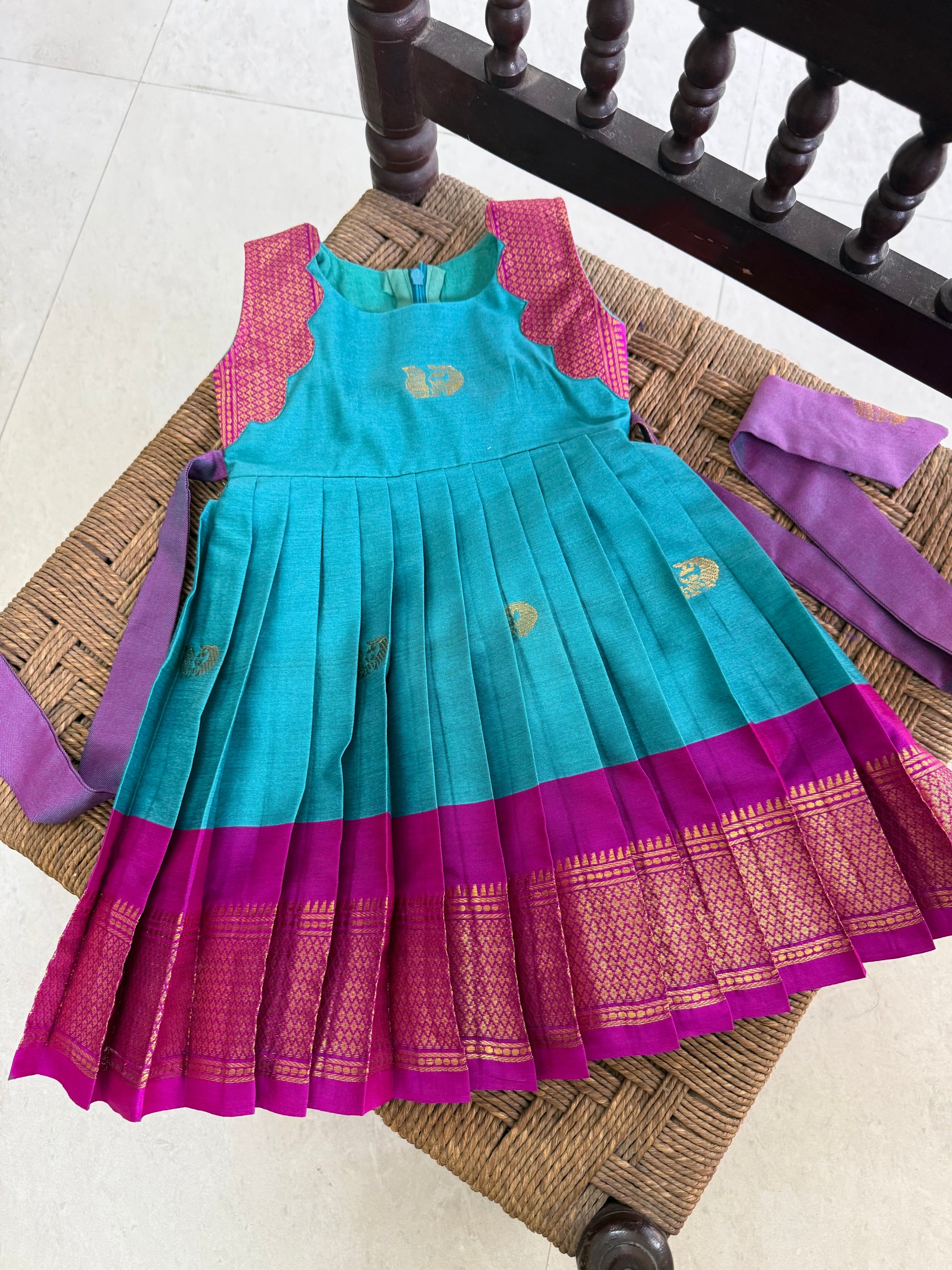 Elegant and festive, our blue and pink short frock is designed to turn heads with its rich color palette and refined craftsmanship. Made from luxurious silk fabric, this frock features a striking combination of blue and pink creating a timeless look, adding a touch of sparkle and elegance. Perfect for birthdays, weddings, and special celebrations, this piece blends traditional charm with modern style.