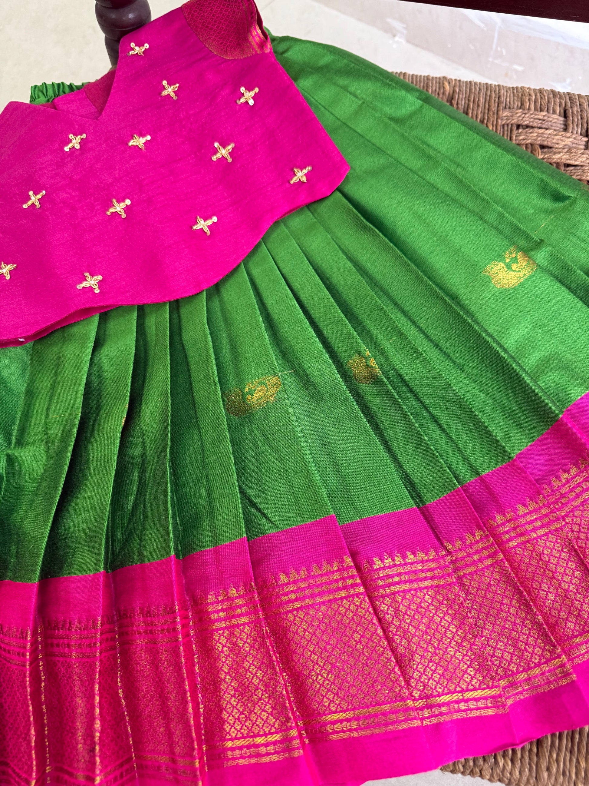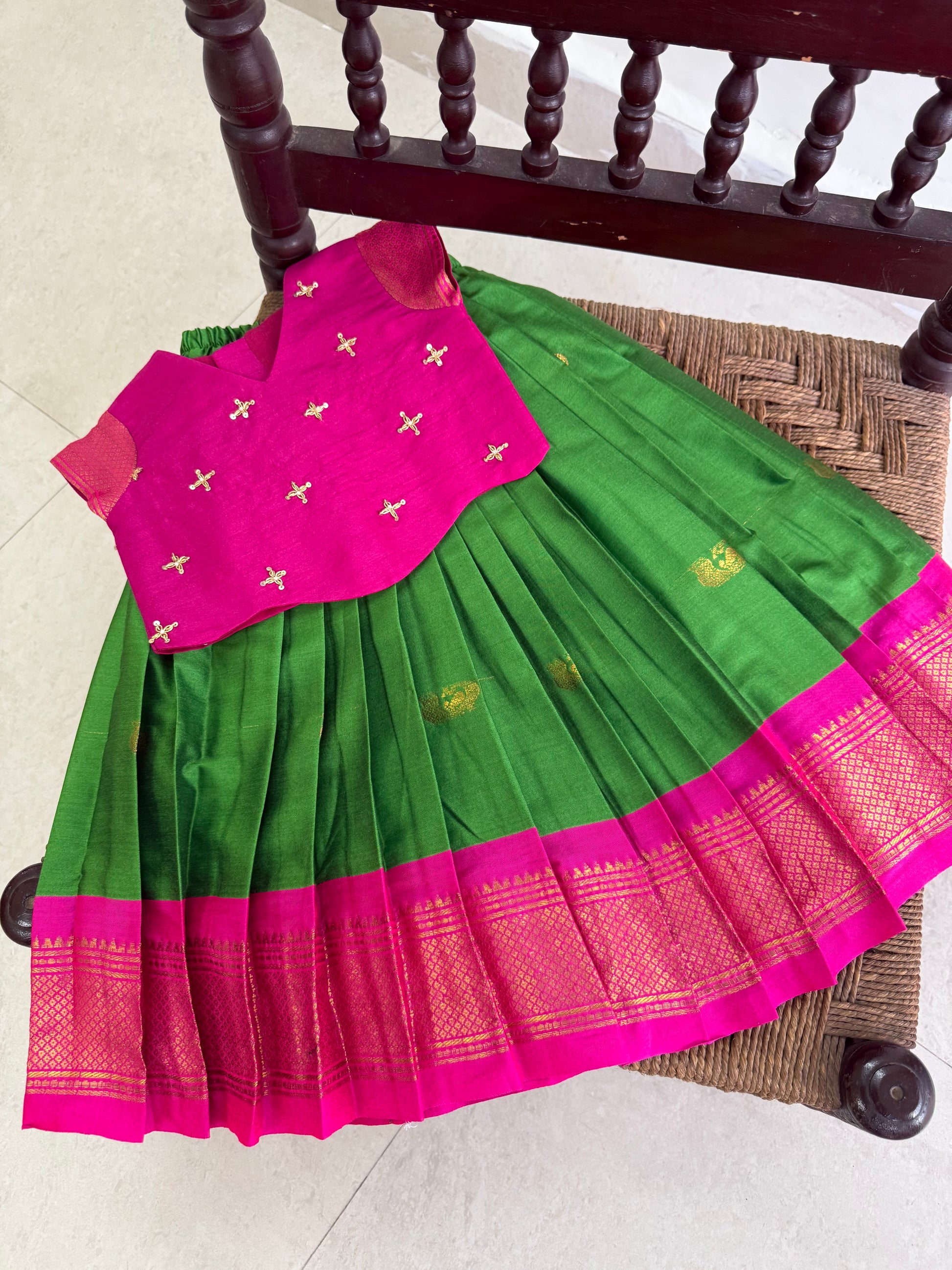 A graceful lehenga set featuring a rich blue pleated skirt with contrast royal blue border in zari detailing. Paired with a matching royal blue blouse adorned with delicate golden motifs, this traditional pattu set is perfect for festive occasions, weddings, and cultural celebrations.